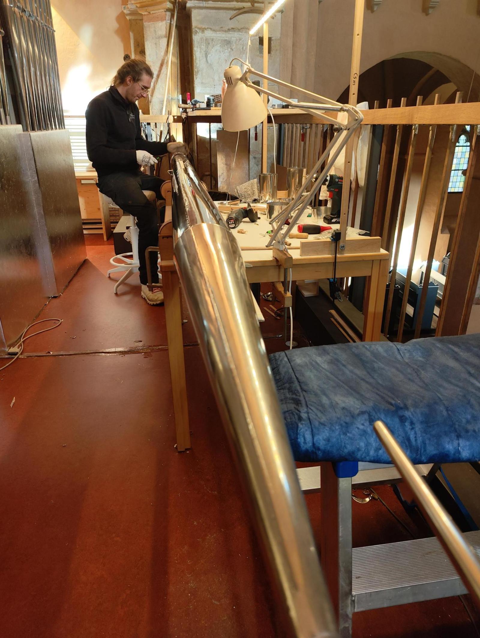 (Text:Pastor Markus Löwe, Bild:Claudius MayWoehl bei der Arbeit auf der Orgelempore an einer Prospektpfeife)